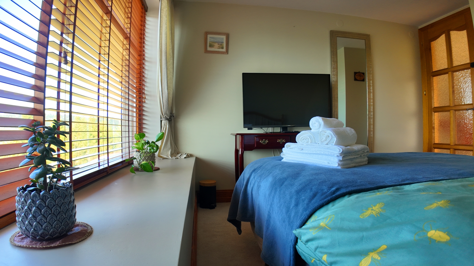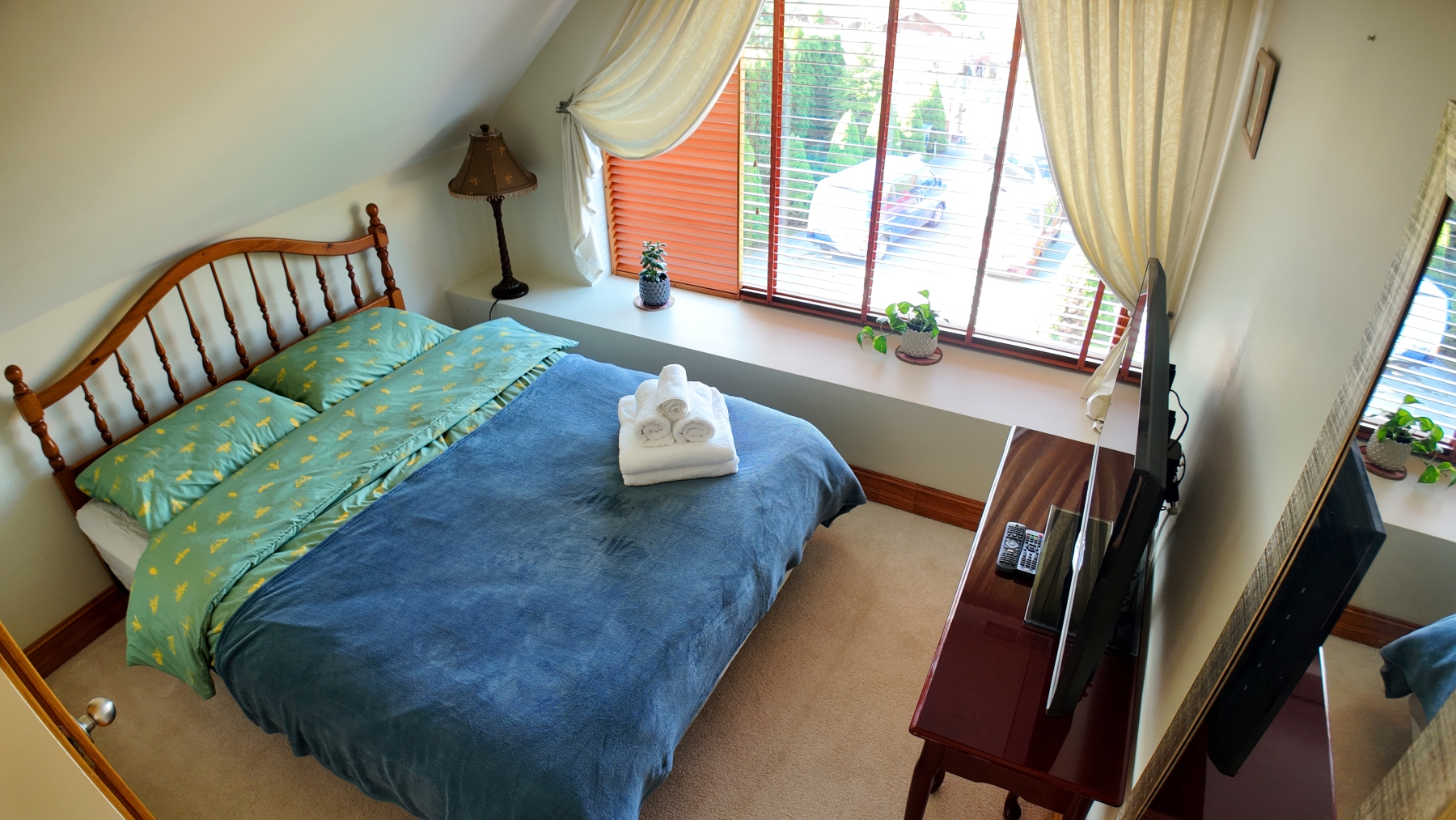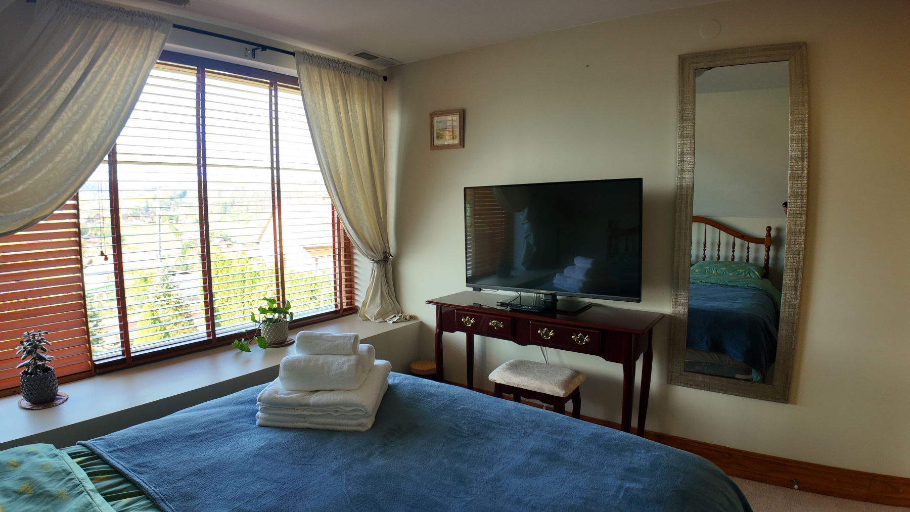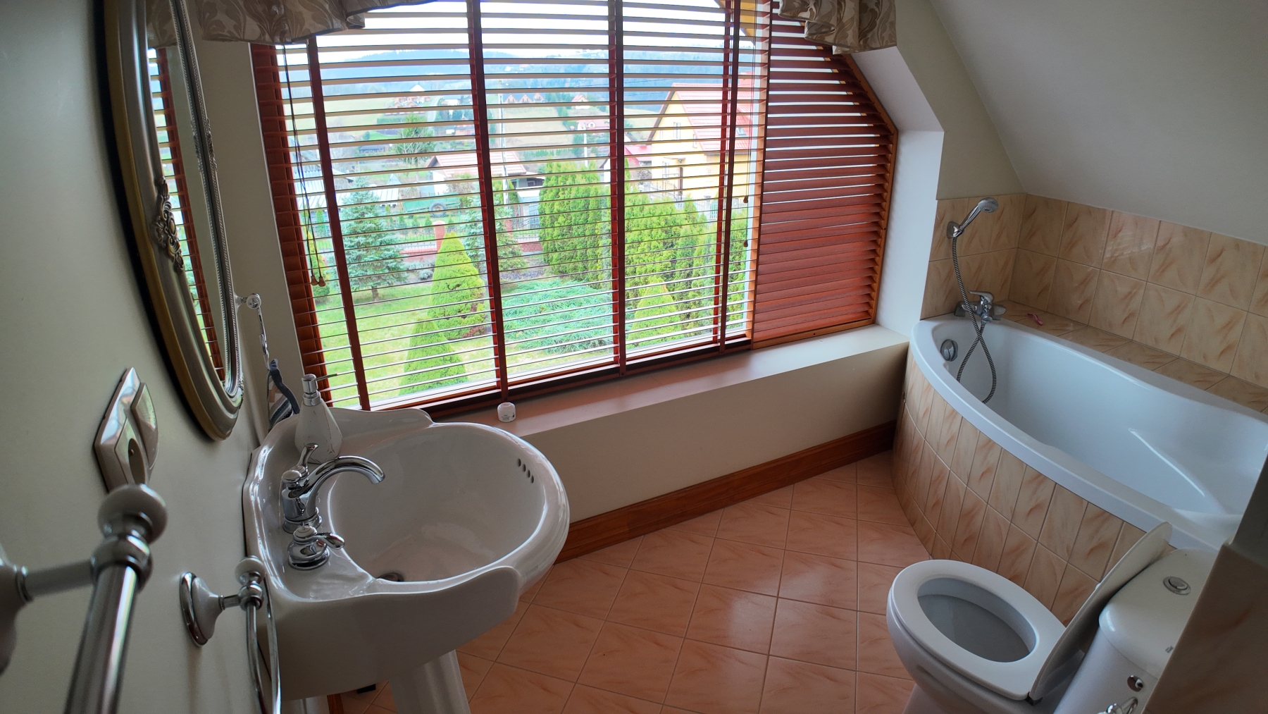 Pokój dwuosobowy ze wspólną łazienką oferuje widok na zielone wzgórza Bieszczad z najwyższego piętra domu. Zachodnia ściana pozwala cieszyć się przepięknymi zachodami słońca. W pokoju znajdziesz osobne pomieszczenie, służące jako mała garderoba. Niebieski Zakątek mieści się na drugim piętrze domu. Wspólna łazienka z wanną z widokiem zlokalizowana jest na korytarzu i jest dzielona na trzy pokoje znajdujące się na tym samym piętrze. Całkowita powierzchnia to 12 m².