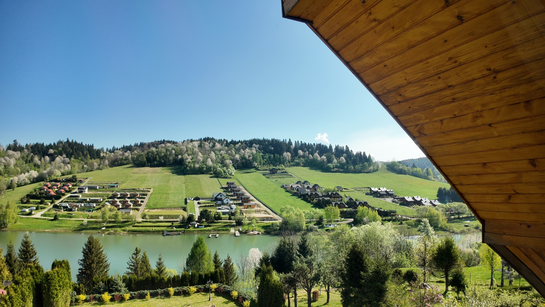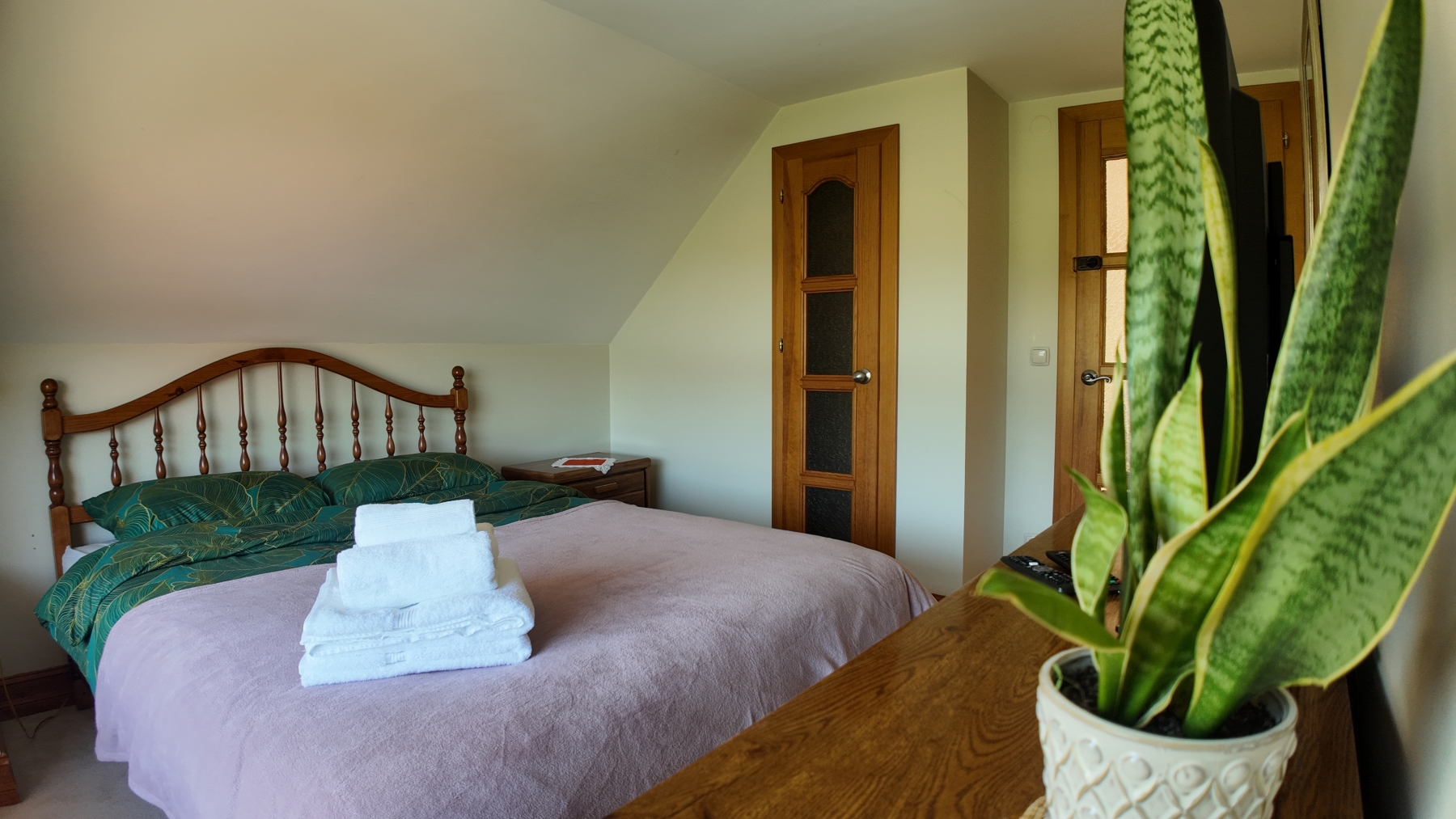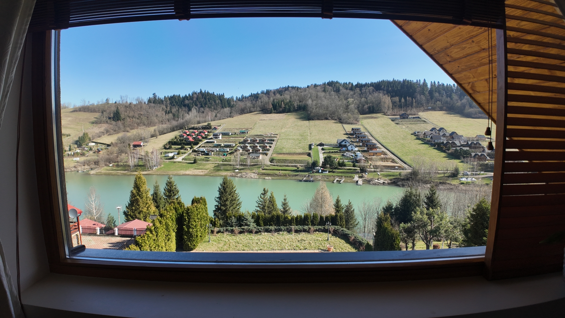 Pokój dwuosobowy ze wspólną łazienką oferuje widok na Jezioro Solińskie z najwyższego piętra domu. Wschodnia ściana pozwala cieszyć się przepięknymi wschodami słońca. W pokoju znajdziesz osobne pomieszczenie, służące jako mała garderoba. Różowa Zatoka mieści się na drugim piętrze domu. Wspólna łazienka z wanną z widokiem zlokalizowana jest na korytarzu i jest dzielona na trzy pokoje znajdujące się na tym samym piętrze. Całkowita powierzchnia pokoju to 14 m².