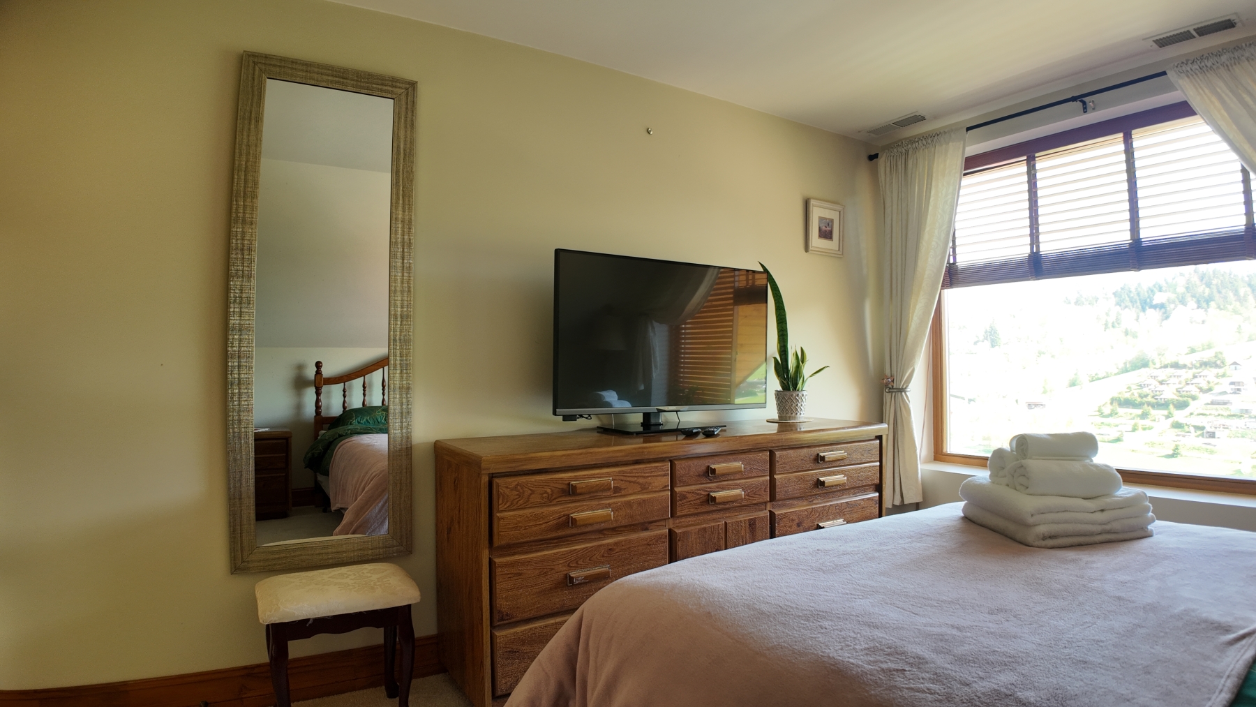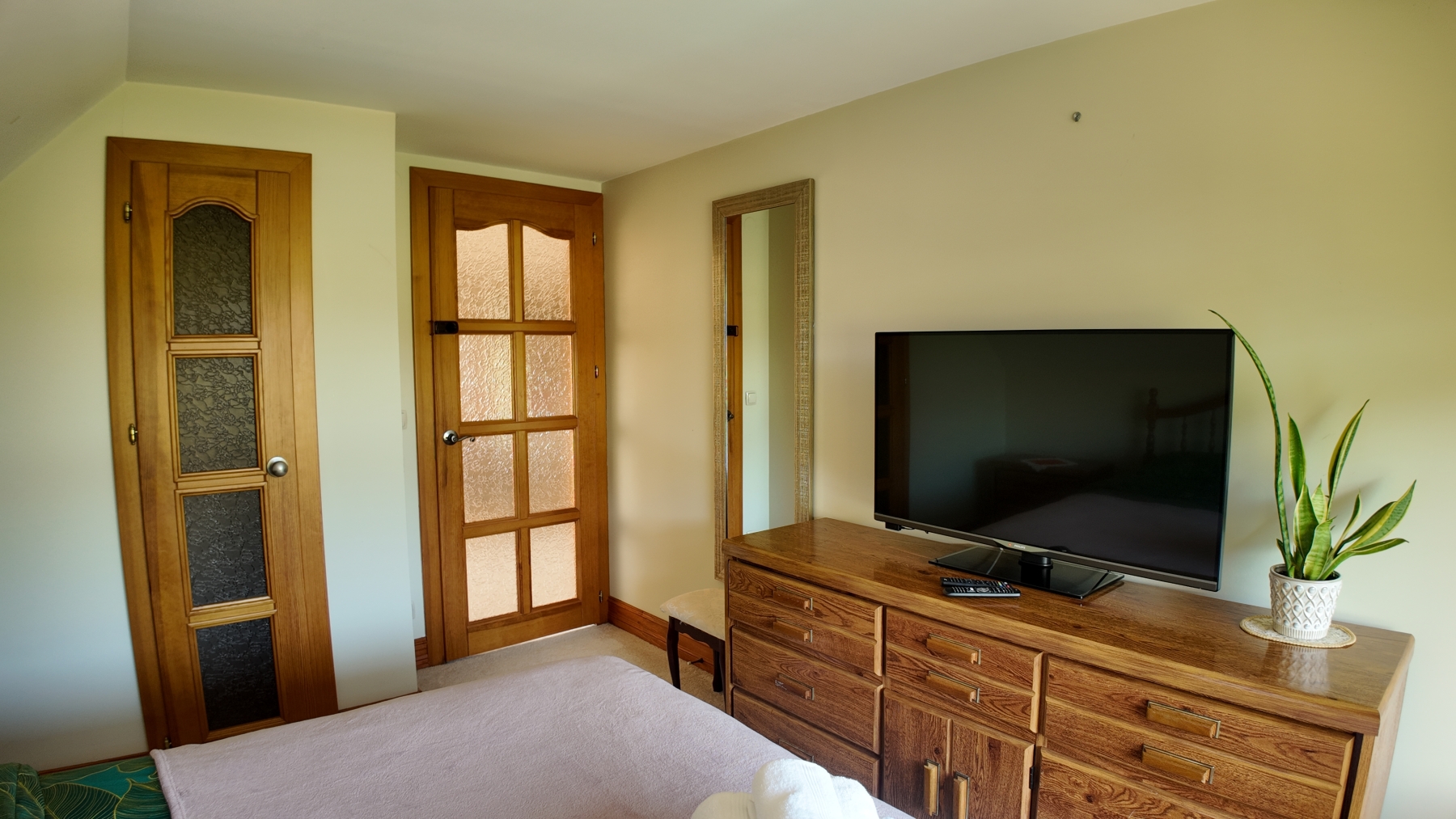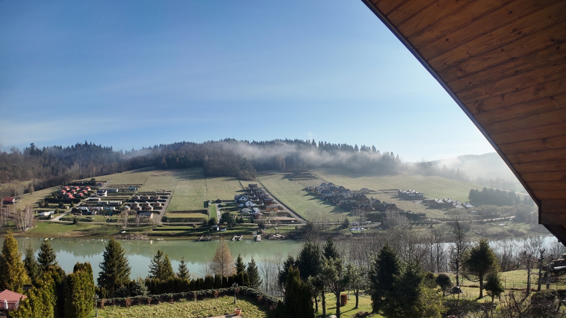 Pokój dwuosobowy ze wspólną łazienką oferuje widok na Jezioro Solińskie z najwyższego piętra domu. Wschodnia ściana pozwala cieszyć się przepięknymi wschodami słońca. W pokoju znajdziesz osobne pomieszczenie, służące jako mała garderoba. Różowa Zatoka mieści się na drugim piętrze domu. Wspólna łazienka z wanną z widokiem zlokalizowana jest na korytarzu i jest dzielona na trzy pokoje znajdujące się na tym samym piętrze. Całkowita powierzchnia pokoju to 14 m².